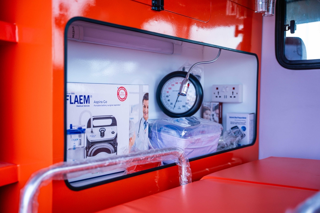 • Auto Loading Stretcher • Folding Stretcher • Portable Suction Unit • Oxygen Cylinders 10 Liters Qty 01 • Oxygen Gauges Qty 01 • Oxygen Outlets Qty 01 • Flow meter & Humidifier Qty 01 • IV Hooks • Sharp Container • Wall mounted sphygmomanometer • First Aid box wall mounted for 25 persons • Stethoscope • Oxygen Mask Peads & Adult • Intravenous administration set