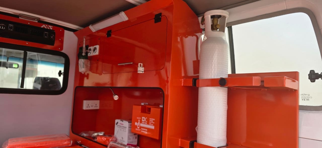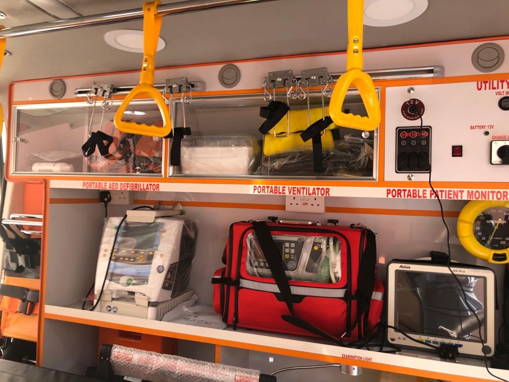 • Steel Cabinet for medical equipment’s and medicines with Stainless steel wash basin • Acrylic sliding doors with aluminum sliding channels at the necessary places • Aluminum composite panels or upholstery for interior walls • Flooring with marine plywood and Vinyl coating • Bulkhead with Sliding Glass Window • Attendant Seat tip-up bench with under seat storage area • Polyurethane thermal Insulation in the patient compartment to prevent from heat and cold • Doctor Chair with seat belt • Grab handle • Air condition • Electrical Control panel box with fuses • Electrical Outlets-12V DC • Electrical Outlet- 220V AC • LED Interior lighting • LED Multi flashing Roof Light Bar with siren and Speaker • LED Side Strobe Lights • Lettering & Livery design • Frosted Side Glass • Ventilation Fan • Fire Extinguisher 2Kgs • Trash Box • Power Inverter 1000w • Emergency Hammer • Examination light